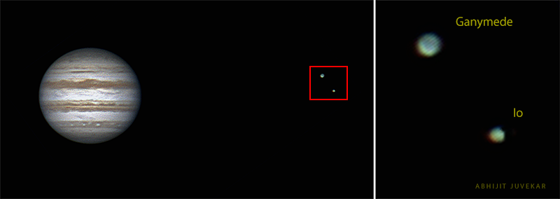 Jupiter Ganymede & Io stacked output captured using ZWO ASI120MC-S camera on Orion 3X Barlow with Sky-watcher 10 inch Dobsonian Telescope.