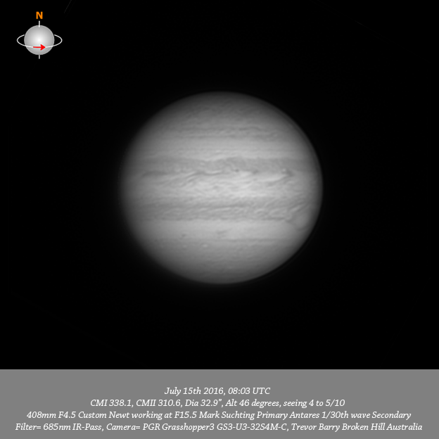 685nm IR data. GRS on P limb and nice detail in GRS wake.