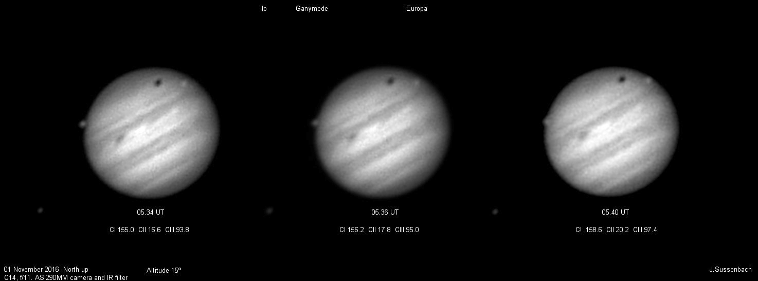 compilation of images taken at 05:34, 05:36 and 05.40 UT, respectively. Note the transits of Ganymede and its elongated shadow, and Europa.