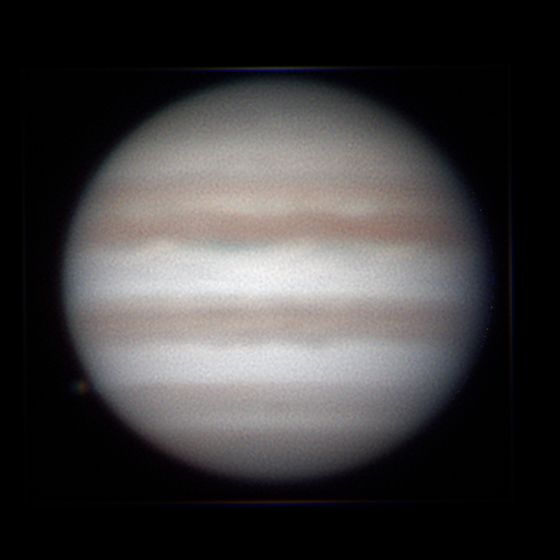 Jupiter & Europa. Stacked RGB channels. N:up, p:right. Equipment: 279mm SCT, ASI 290MM, RGB filters.