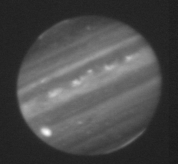 3.80-micron (L' filter) observation of Jupiter taken by the staff of NASA's Infrared Telescope Facility (IRTF) using the guide camera of the SpeX facility infrared spectrometer as a part of a program to characterize atmospheric variability in Jupiter to support the Juno mission. This filter is sensitive to sunlight reflected from clouds as deep as 1 bar, plus some additional radiation from H3+ aurora toward the poles.