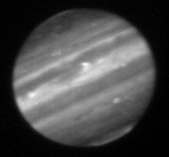 3.80-micron (L' filter) observation of Jupiter taken by the staff of NASA's Infrared Telescope Facility (IRTF) using the guide camera of the SpeX facility infrared spectrometer as a part of a program to characterize atmospheric variability in Jupiter to support the Juno mission. This filter is sensitive to sunlight reflected from clouds as deep as 1 bar, plus some additional radiation from H3+ aurora toward the poles.