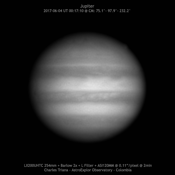 Jupiter 2017/06/04 (UT) 00:17:10 CM= 75.1°/ 97.9°/ 232.2° SCT LX200UHTC 254mm + Barlow 2x + RGB Filters + ASI120MM @ 0.11”/pixel (f/29) L: 1677 frames @ 34 fps @ 49sec S: 5/10 – T: 4/5 – Alt: 78°