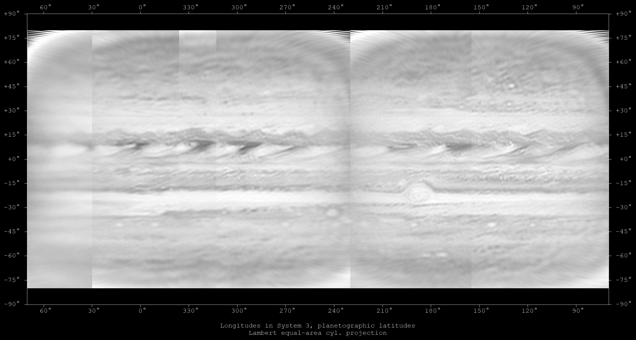 Equirectangular map of images taken over two sessions, the first near 08h UT on 4th September (longitudes near the GRS), the second near 08h UT on 5th September (near 345 deg & PJ15)