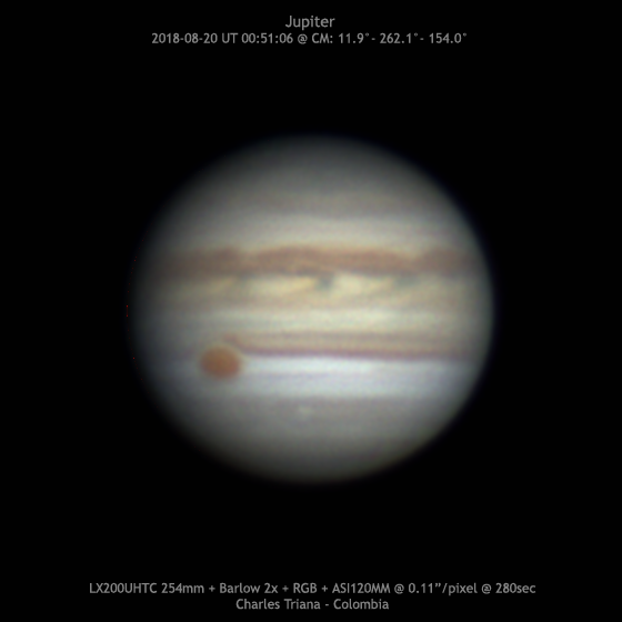 Jupiter 2018/08/20 (UT) 00:51:06 CM= 11.9°/ 262.1°/ 154.0° SCT LX200UHTC 254mm + Barlow 2x + RGB Filter + ASI120MM @ 0.11”/pixel (f/29) RGB: 2086/1576/1078 frames @ 29/33/21 fps @ 280sec S: 5/10 – T: 4/5 – Alt: 42° Charles Triana - Colombia