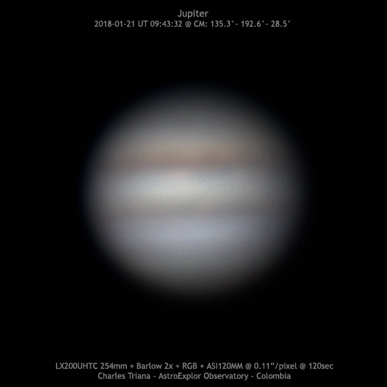 Jupiter 2018/01/21 (UT) 09:43:32 CM= 135.3°/ 192.6°/ 28.5° SCT LX200UHTC 254mm + Barlow 2x + RGB Filters + ASI120MM @ 0.11”/pixel (f/29) RGB: 1199/1198/962 frames @ 29/29/24 fps @ 120sec S: 3/10 – T: 4/5 – Alt: 49°