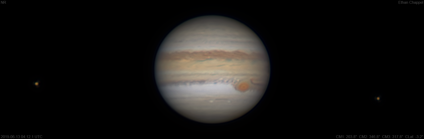 I decided to setup the C8 even though I wasn't convinced in the moment the sky conditions would be good. The live view was turbulent, but slower than I'm used to seeing. I had both my imaging trains in the same place, so I decided to do a comparison between my ZWO filters for the C8 and my Chroma filters used with the C11 and C14. This image was done through the ZWO filters, while next image will be with the Chroma filters. Notes: White Oval Z is faintly visible on the North Equatorial Belt, north of the Great Red Spot. The Equatorial Zone is orange. The GRS is off-center in its hollow. The GRS hollow is unusually dark. South Equatorial Belt clouds are circulating around the GRS and into the South Tropical Zone to the east. The SEBs is dark and clumpy. Io and Europa appear left and right of the planet respectively.