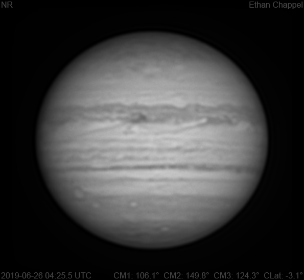 The sky continued to defy an unfavorable forecast, so I hastily captured a near infrared image before it ended. Notes: A long rift on the North Equatorial Belt is approaching the central meridian. The southern South Equatorial Belt is very dark. Oval BA is rising. The faint streak in the South Temperate I noted on an image from June 2 is at the central meridian. The South Polar Red Spot is just east of the CM.