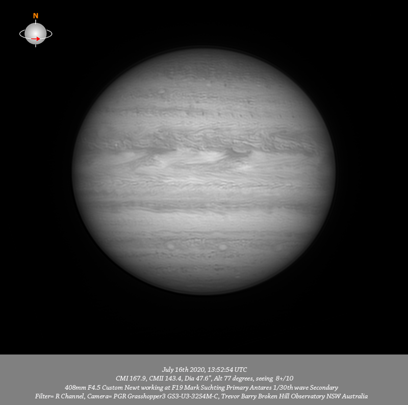 R channel data. Imaged Jupiter July 16th in good seeing, have exceptional data, arguably my best Jupiter data for this apparition. Stacked 100% of the Ch4 data and 80% to 90% of all 685nm IR, R, G & B data. Have great depth of resolved detail from pole to pole and limb to limb, the fine detail that was visible in the live feed was extraordinary. I note two very small bright ovals near the CM on the edge of the NPR. There is a small bright oval between the F limb and CM in the NNTB. A formation of tiny dark spots are resolved spread across the NTB from limb to limb. The intricate structure within the NEB is very well resolved at all wavelengths. Two dark most extravagant festoons stream from the Southern edge of the NEB back through the EZ. Most delicate structure is seen across the EZ and in a band across the Northern edge of the SEB. I note a red barge near the CM just toward the P limb. There is considerable very fine resolved detail in the SSTB including a line of three bright ovals and there is an assortment of tiny dark spots within the SPR.