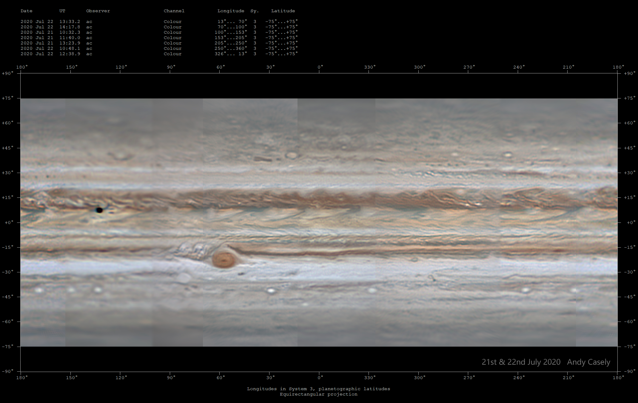 Combined map from 7 RGB observations on 21st & 22nd June to make a 360 degree composite. Images from 100-250deg are from the 21st. Image times 21st - 10:32-13:24; 22nd - 10:48-14:18UT
