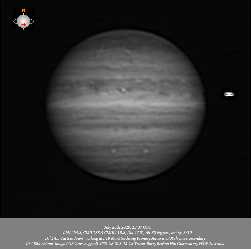 Ch4 data. Imaged Jupiter July 28th in only fair seeing. In support of Glenn Orton’s run with Subaru I have taken two Ch4 runs centered 1 hour apart each night I have imaged through the week he had Subaru, so July 28th, 29th & 30th. The first Ch4 run at the start of the session was significantly cloud effected but it cleared away for the rest of the session. The 2nd Ch4 run does seem to show the recent wave form seen in the EZ which rotates in L3 not L1. The 685nm IR, R and RGB data does resolve some detail. I note two tiny bright spots on the Southern edge of the NPR. A formation of very small compact dark spots are seen aligned in the NTB. Very fine structure is resolved within the NEB with a quite prominent bright spot seen at all wavelengths near the Southern edge. Some detail is resolved along the Southern edge of the SEB with three small bright ovals aligned across the SSTB.