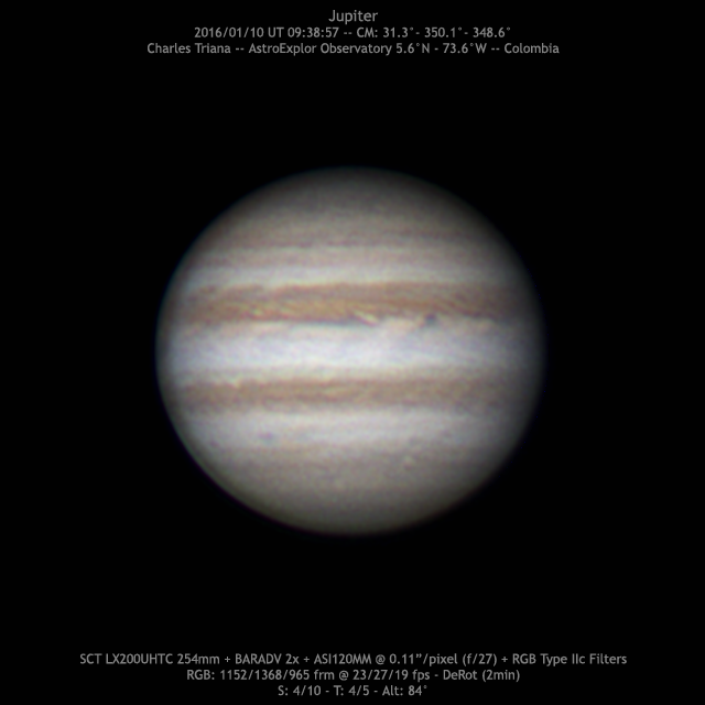 SCT LX200UHTC 254mm + AP BARADV 2x + RGB Filters + ASI120MM @ f/27 RGB: 1152/1368/965 frames @ 23/27/19 fps – DeRot (2min) S: 4/10 – T: 4/5 – Alt: 84° Charles Triana - AstroExplor Observatory - Colombia