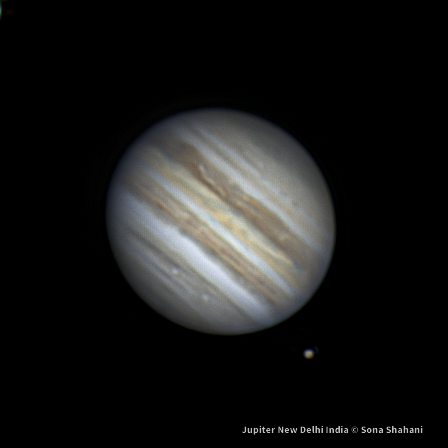 Jupiter & one of it's Galilean moon Ganymede as seen from Delhi Skies under average seeing conditions. Equipment Used: 8"Skywatcher Collapsible Dobsonian, ZWO ASI178MC, 2X Celestron Barlow, Manual tracking. Capturing Software: SharpCap,PIPP,ASi3 & wavelets in Registax. Fine tuned in LR