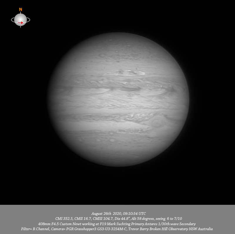R channel data. Imaged Jupiter August 26th. There was a mostly thin veil of cloud from horizon to horizon but the seeing was steady and a surprising level of detail could be seen across the planet at all wavelengths. All data was captured through cloud with only the Ch4 seemingly suffering from it. The NTrZ outburst is very well resolved, particularly so in the 685nm IR, R, G & B data; it almost looks like a comet head with a split tail. I note a prominent small red oval on the Southern edge of the NPR with a line up of four v-small dark spots below along the NNTeB. Structure within the NEB is well resolved as are four dark features along the Southern edge of the NEB associated with festoons in the EZ. Circulation can be seen within the GRS with the trailing disturbed region well resolved. Oval BA is well seen as is the disturbed region immediately following it and the formation of three white ovals in the SSTeB is very well resolved. A v-thin dark dash is well resolved leading the formation of white ovals on the Northern edge of the SPR.