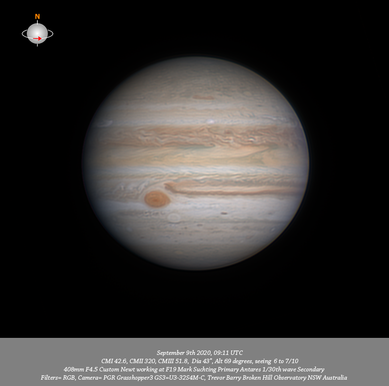 RGB data. Imaged Jupiter September 9th in good seeing have very nice depth of detail across the field. I note a prominent red oval toward the P limb on the Southern edge of the NPR. There is considerable fine detail within the NPR. Quite prominent in R, G, B, & UV is a thin red band near the CM on the Southern edge of the NPR. NTeZ outbreak #3 is near the CM while outbreak #2 is coming in from the F limb. The intricate detail within the NEB is well seen with several concentrated bright spots. Two prominent dark regions associated with festoons in the EZ are seen on the Southern edge of the NEB. The GRS chimneys remains open and Oval BA has a prominent ring within it resolved in R, G & B data. Clydes spot is toward the P limb while DS6 is resolved as two separate spots in all 685nm IR, R, G & B data. Very fine detail is resolved in the disturbed region following Oval BA and many v-small dark spots are resolved in the STB & SSTeB with a red oval resolved toward the F limb in the SPR. The CH4 data resolves a bright spot within the GRS chimney.