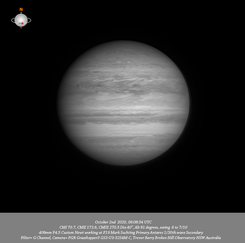 G channel data. Imaged Jupiter October 2nd in mostly good seeing. The head of outbreak #1 is seen toward the end of this session coming over the F limb. It is preceded by the quite incredible linear structure still visible from the other outbreaks. These data resolve a plethora of tiny compact dark spots within the NPR, two bright ovals are well resolved on the Southern edge of the NPR near the CM. The extremely delicate structure within the NEB is well resolved from limb to limb. A highlight of these data are the quite black features which seem associated with festoons in the EZ; although these have been prominent at least since February they have become even darker, thinner and just so delicate. The dark feature near the CM in these IR, R, G & B data is accompanied by two very compact bright spots v-close together just under the F end of the tail of the dark feature on the Southern edge of the NEB. A prominent small bright oval is well seen on the Northern edge of the SPR.