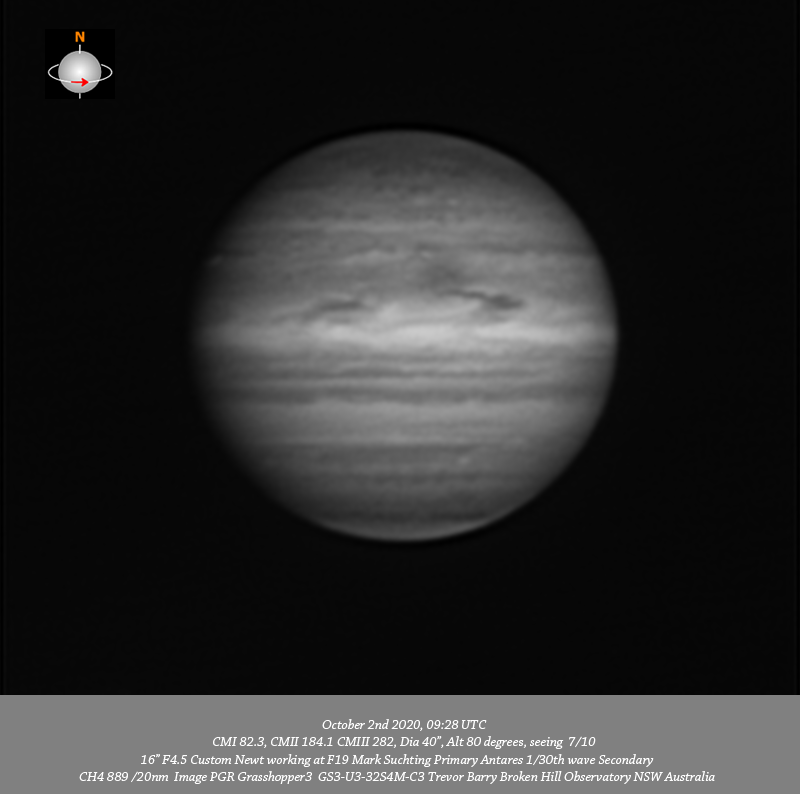 CH4 data. Imaged Jupiter October 2nd in mostly good seeing. The head of outbreak #1 is seen toward the end of this session coming over the F limb. It is preceded by the quite incredible linear structure still visible from the other outbreaks. These data resolve a plethora of tiny compact dark spots within the NPR, two bright ovals are well resolved on the Southern edge of the NPR near the CM. The extremely delicate structure within the NEB is well resolved from limb to limb. A highlight of these data are the quite black features which seem associated with festoons in the EZ; although these have been prominent at least since February they have become even darker, thinner and just so delicate. The dark feature near the CM in these IR, R, G & B data is accompanied by two very compact bright spots v-close together just under the F end of the tail of the dark feature on the Southern edge of the NEB. A prominent small bright oval is well seen on the Northern edge of the SPR.