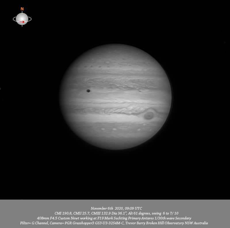 G channel data. Imaged Jupiter November 6th in good seeing, have most excellent depth of resolved detail from limb to limb & pole to pole at all wavelengths. Io + shadow are in transit. I note multiple resolved bright spots in the NPR very near the pole. I note a prominent small dark oval near the CM on the Southern edge of the NPR. A small bright oval is well resolved in the NNTeB midway between the F limb and CM with a very well resolved series of five compact dark spots resolved below it. Very fine and quite intricate structure is resolved in the NEB. The reddish colour of most of the EZ is apparent in the RGB while the G and particularly the B channels well show the extent of the shading across the EZ. The disturbed region following the GRS is well seen as is circulation within the GRS with AWO-STZ seen on the Northern edge of the STB below the GRS. A series of three bright ovals consisting of A5, A4 & A3 are resolved in the SSTeB.