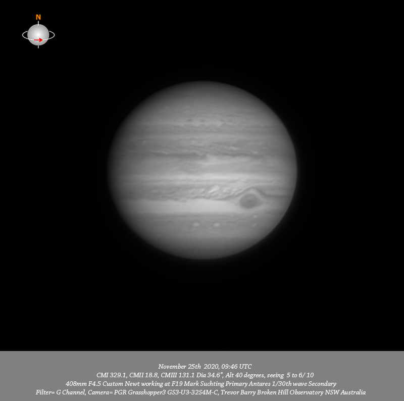 G channel data. Imaged Jupiter November 25th in quite reasonable seeing, have very good depth of resolved detail across the field. There is a plethora of very fine dark spots resolved in the NPR. Many small dark spots are resolved in the NTeZ including a formation of four quite prominent larger dark spots. The NEB is full of quite intricate detail including very prominent dark structures along it’s border with the EZ. The reddish colouring within the EZ is well seen. Circulation is resolved within the GRS and the leading edge of the GRS has a prominent extension seen in IR , R, G & B data. The turbulent region following the GRS included a very bright elongated feature which is seen in IR, R, G & B data and very prominent in CH4. STZ-AWO is resolved below the GRS on the edge of the SEB while I believe the three white ovals aligned in the SSeB are from the left A5, A4 & A3.
