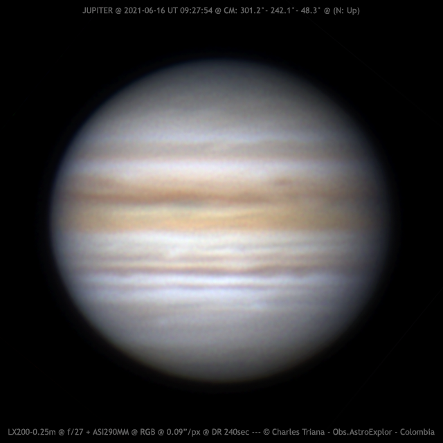 Jupiter 2021/06/16 (UT) 09:27:54 CM= 301.2°/ 242.1°/ 48.3° SCT LX200UHTC 0.25m + Barlow 2x + ASI290MM + RGB Filters @ 0.09”/pixel (f/27) RGB: 4462/1887/2341 frames @ 84/47/37 fps @ 240sec S: 6/10 – T: 4/5 – Alt: 73° Name: Charles Triana CityName-CountryName: Bogota-Colombia