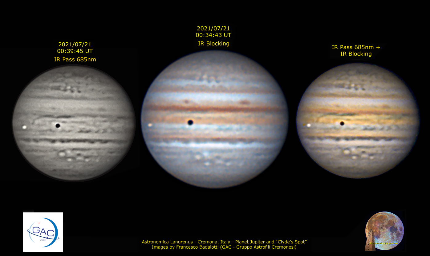 To complete my previous mail about the same subject I send you these images of planet Jupiter. Planet Jupiter taken from Cremona (Northern Italy) through a 255mm F20 Maksutov Rumak telescope + Zwo ASI 224MC CMOS color camera + ADC Corrector + Baader IR Pass 685nm filter / IR Blocking filter. Stacked 400/3600 frames at 30 fps. Software videocapture Sharpcap. Frames was aligned and stacked by Autostakkert. Images has been processed with software Astrosurface, Fitswork, Camera Raw. I so obtained an RGB image and Monochromatic image. Finally these RGB and Monochromatic images was added together. About the Clyde's Spot I have indicated the area in wich perhaps can be seen this detail. Can you confirm wich is exactly the Clyde's Spot in my images ?
