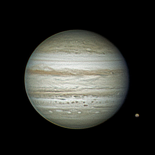 Jupiter 2022-08-09 07:53 UT Seeing 9/10 25cm Newtonian 1200mm FL White Light image with UV/IR cut filter ASI178MC at 152 fps