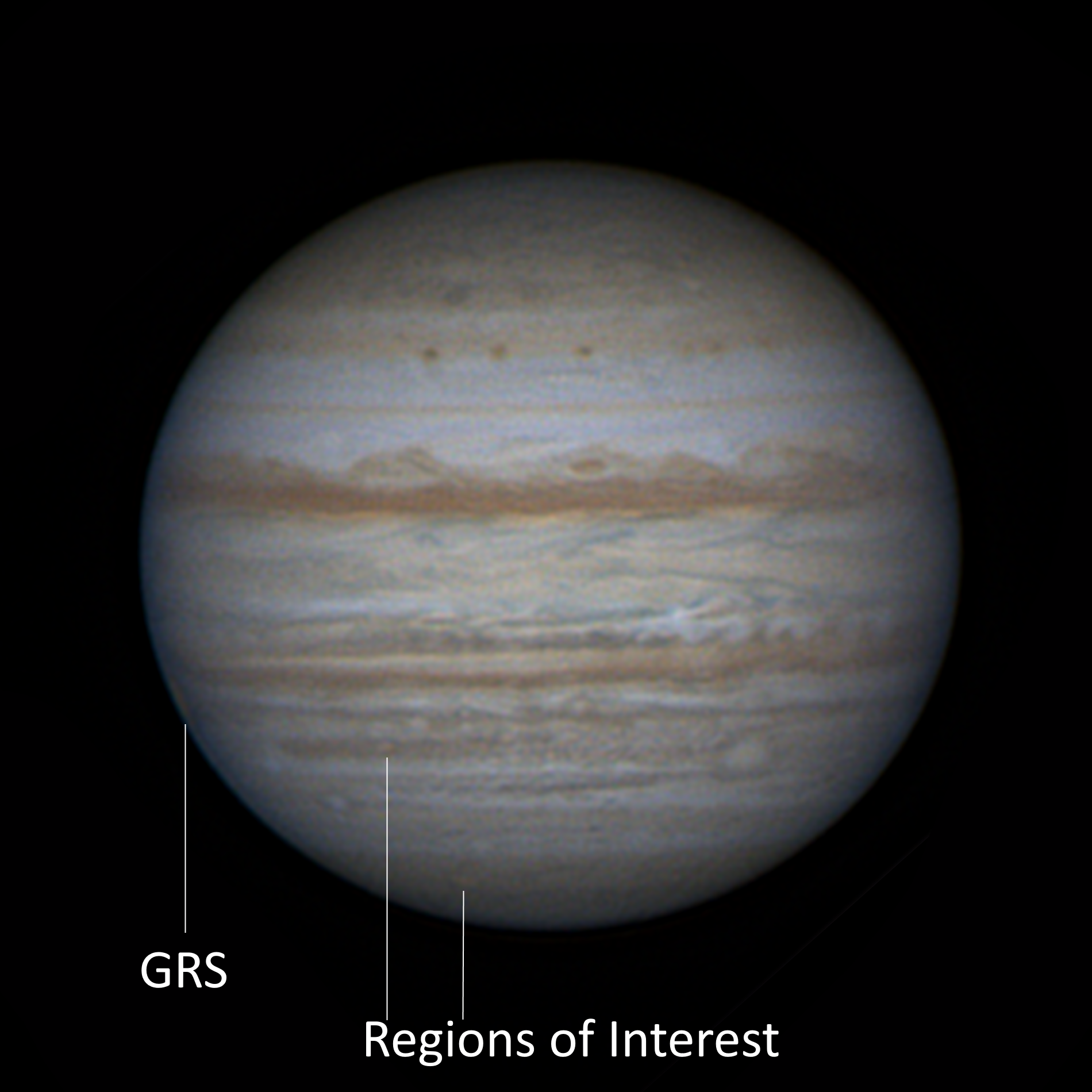 Taken with a C11 SCT, 3x Televue Barlow, ZWO Atmospheric Corrector, and a Player One Uranus C one shot color camera. Total exposure time of 1:30 seconds. Both regions of interest I have labeled appear to be small orange anti-cyclones. These regions have appeared consistently in my data from the 17th, but this should be cross checked regardless. I don't know if they're existence is already known of, however in the event they aren't, I hope this information provides useful. The GRS was labeled as a measure of reference.