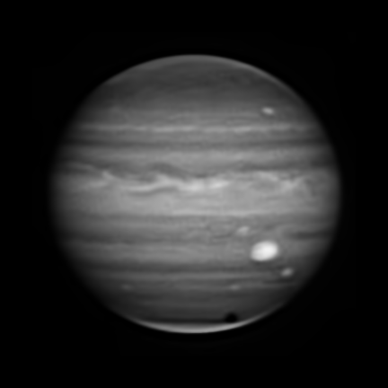 Imaged in methane band at 0.22"/px, 1.5x enlargement. Shadow of Ganymede in transit over SPR.