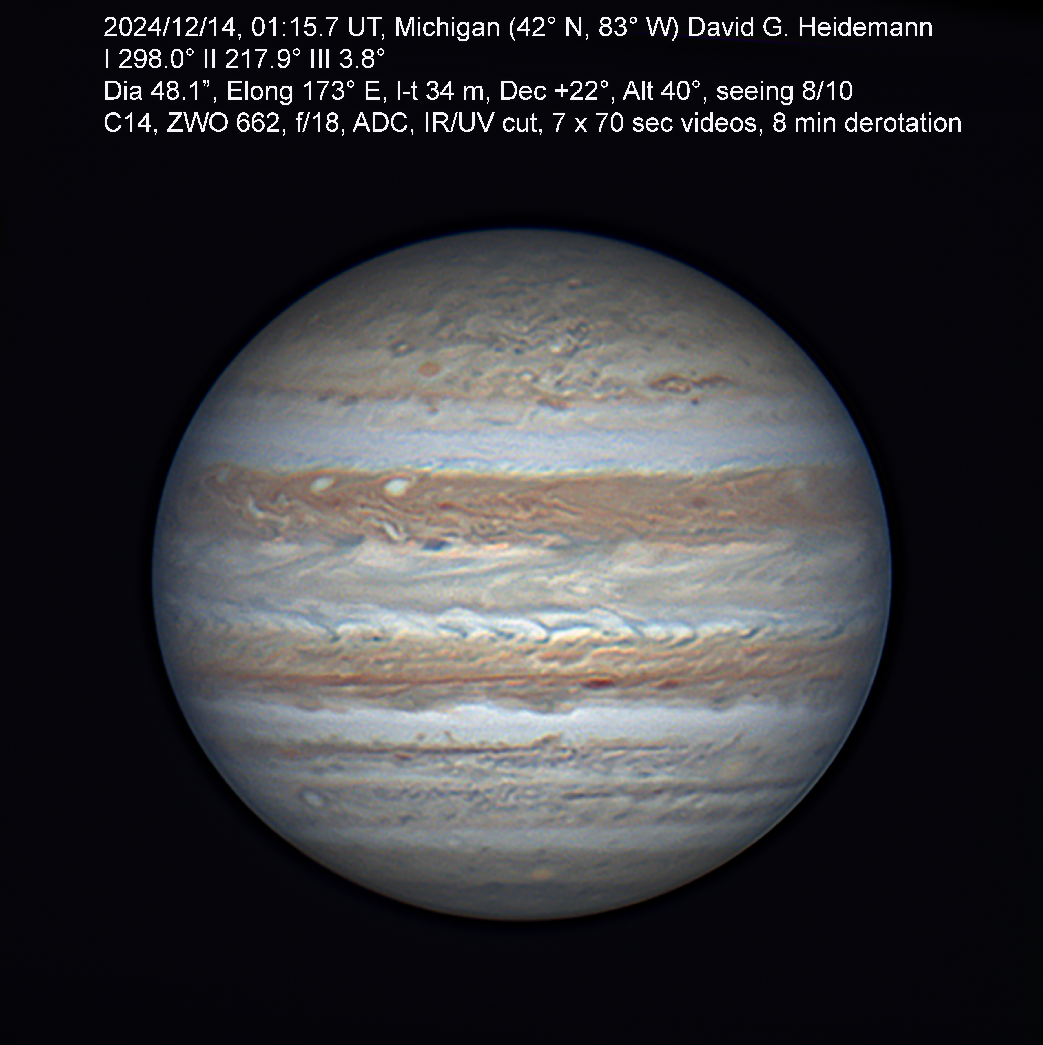 Jupiter from Detroit area on night of excellent seeing; C14; ZWO 662 camera