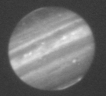 3.80-micron (L' filter) observation of Jupiter taken by the staff of NASA's Infrared Telescope Facility (IRTF) using the guide camera of the SpeX facility infrared spectrometer as a part of a program to characterize atmospheric variability in Jupiter to support the Juno mission. This filter is sensitive to sunlight reflected from clouds as deep as 1 bar, plus some additional radiation from H3+ aurora toward the poles.