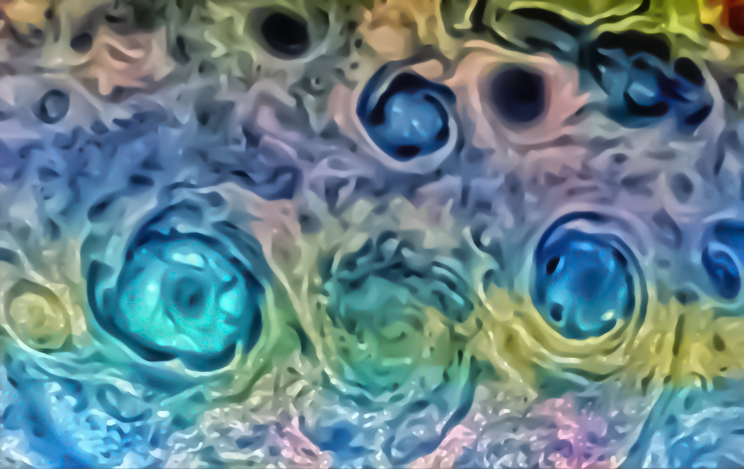 Northern circumpolar cyclones of Jupiter. Highly exaggerated and colorized artistic view.