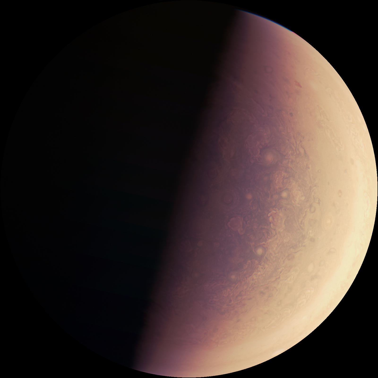 An edited picture of Jupiter's South Pole. Mission Phase is Perijove 1.