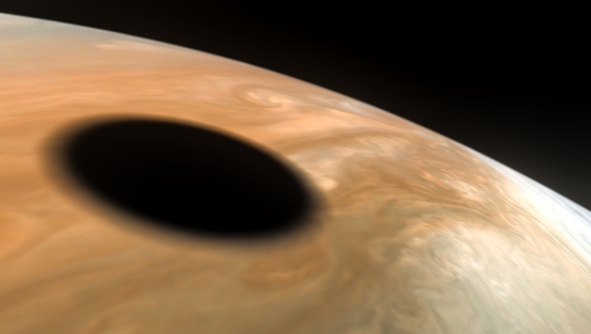 Modified camera viewpoint from actual JunoCam position. Added artificial depth-of-field and illumination blooming effect.