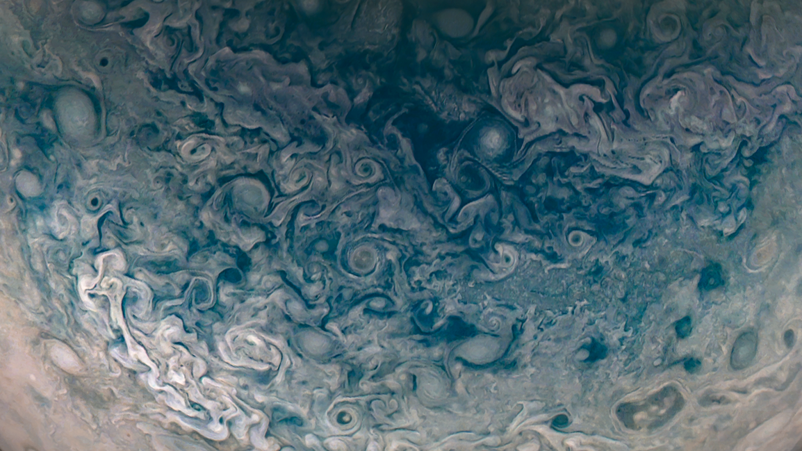 Processed using the JunoCam imager's PJ33 Northern Circumpolar Cyclones raw images and data from NASA's Juno spacecraft flyby on April 15, 2021. Enhanced to highlight features, clouds, colours, and the beauty of Jupiter. Artist's impression - not representative of true colour.