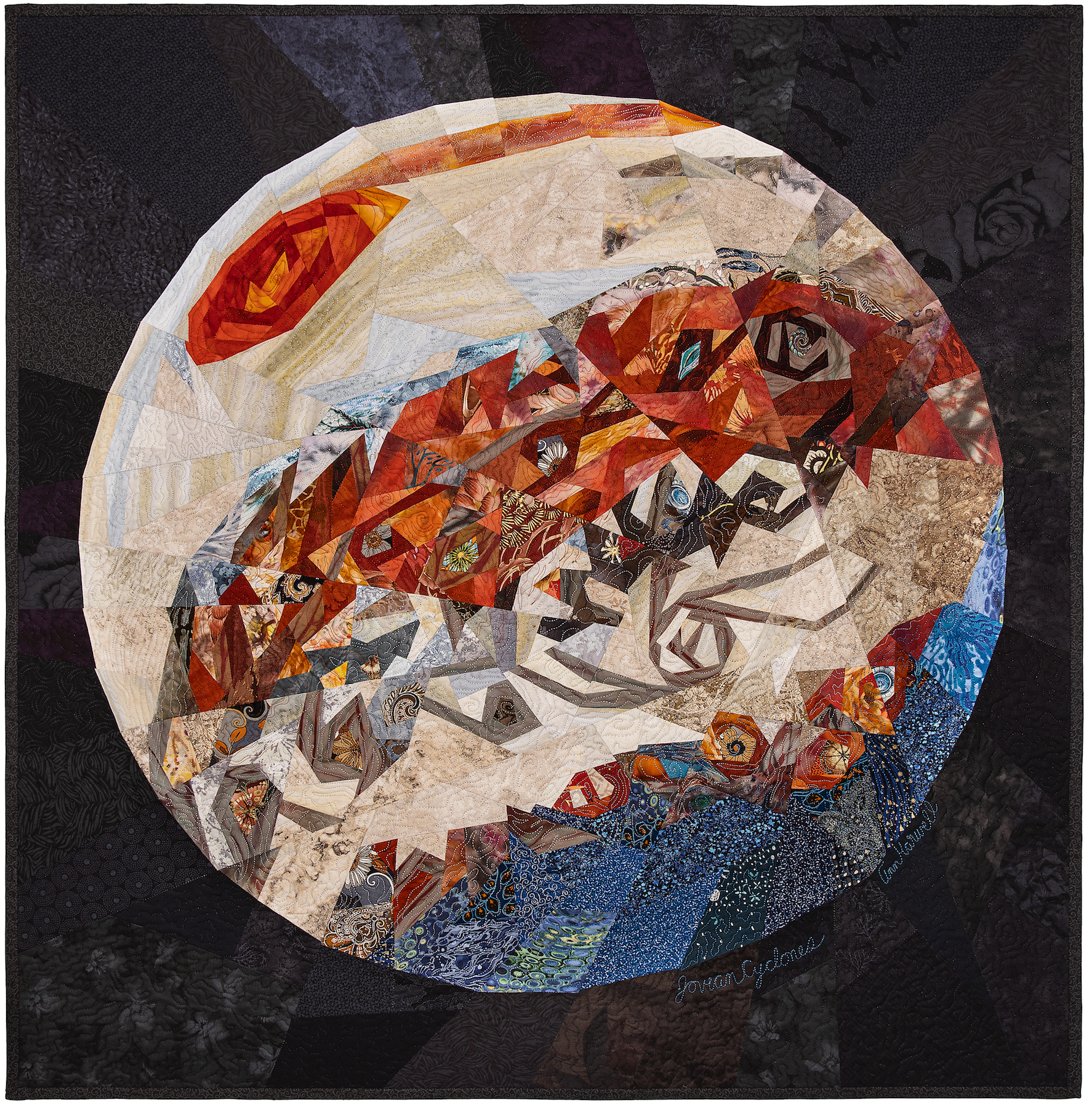 A straight-line design is drafted onto tracing paper, then transferred to pattern material. Cotton fabric is then selected, individually precision cut, and sewn together. The completed top is placed onto a cotton batting and backing fabric and quilted.