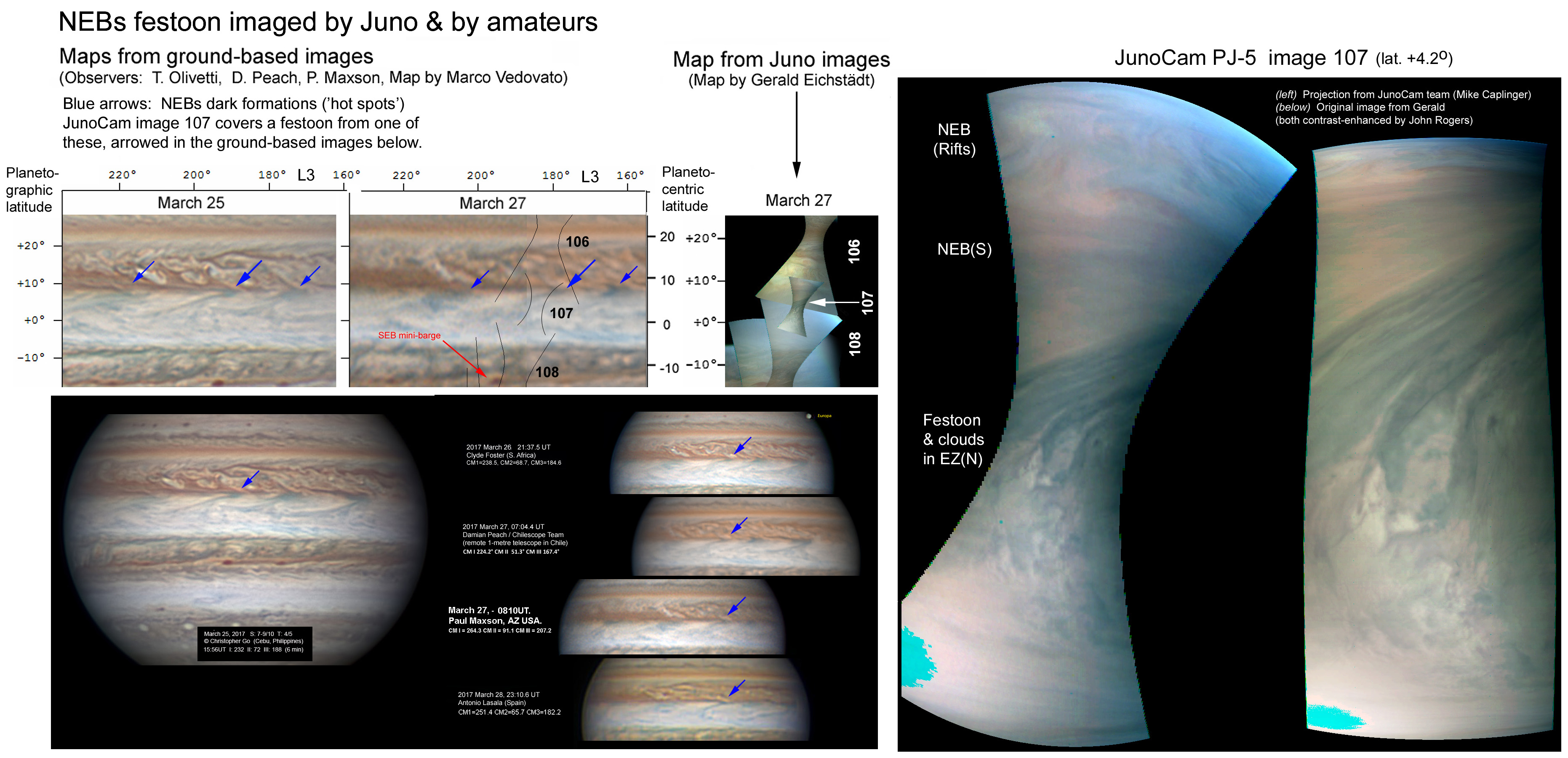 This is the highest-resolution image ever taken of Jupiter, as the altitude was only 3422 km, much lower than previous perijoves! However the cloud texture appears diffuse. The main feature is a very dark festoon in the northern EZ; amateur images show that it extends from a NEBs dark formation (‘hot spot’) just out of the frame. There are patchy white clouds on the east side of the festoon. --John Rogers.