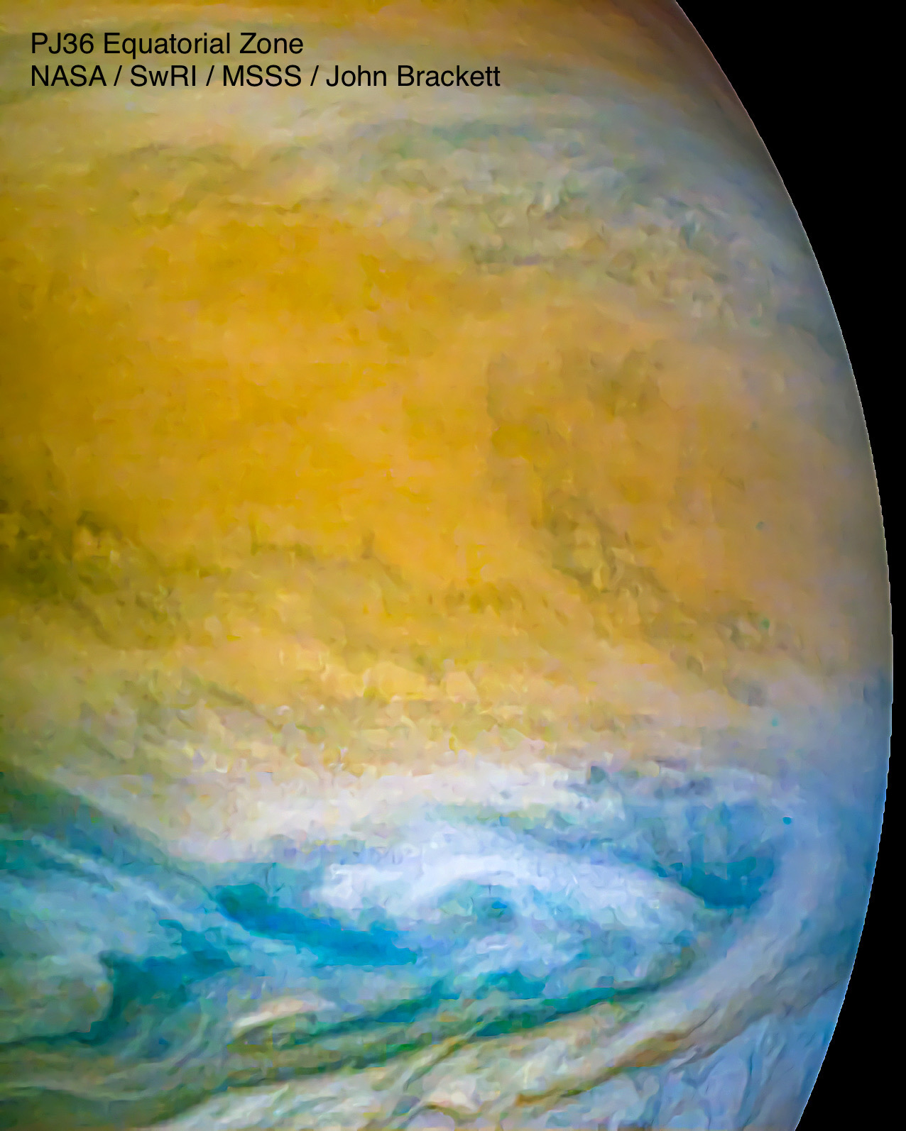 This is a color enhanced, contrast adjusted image of Jupiter’s equatorial zone from PJ36.