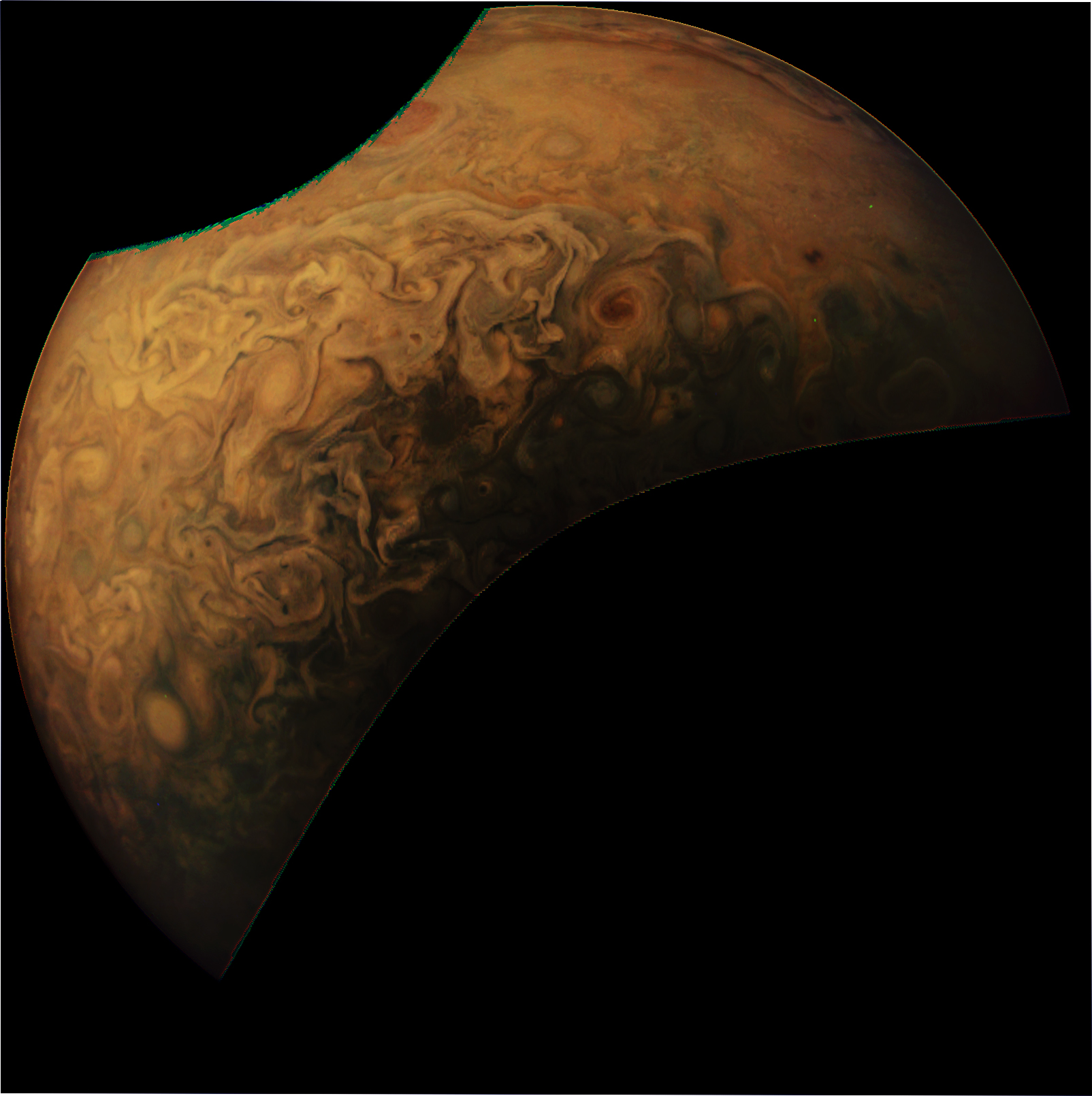 Junocam pixels are 12 bits deep from the camera but are converted to 8 bits inside the instrument using a lossless "companding" table, a process similar to gamma correction, to reduce their size. All Junocam products on the missionjuno website are in this 8-bit form as received on Earth. Scientific users interested in radiometric analysis should use the "RDR" data products archived with the Planetary Data System, which have been converted back to a linear 12-bit scale.
