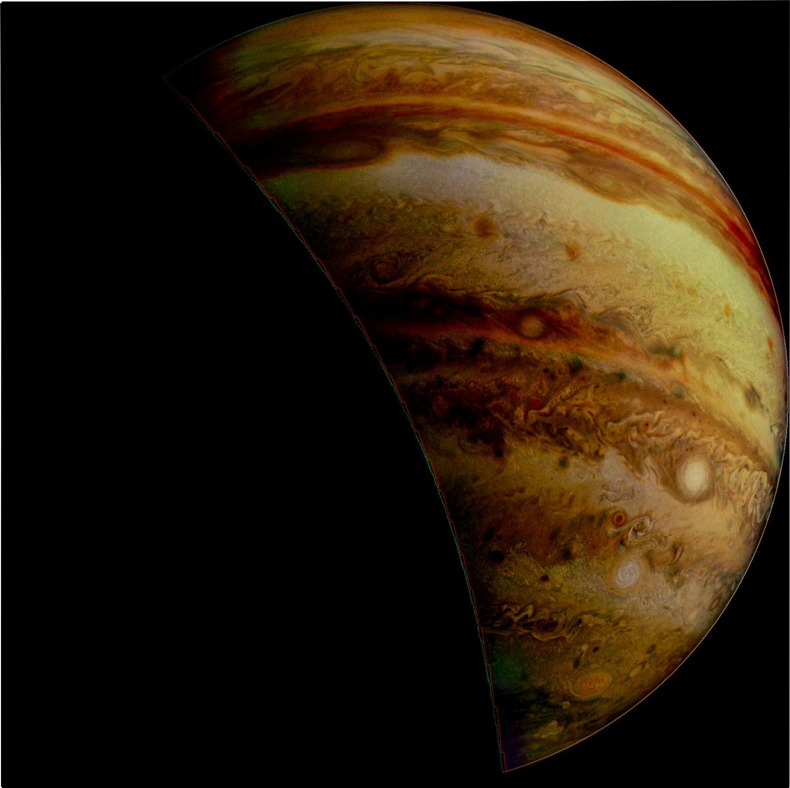 Junocam pixels are 12 bits deep from the camera but are converted to 8 bits inside the instrument using a lossless "companding" table, a process similar to gamma correction, to reduce their size. All Junocam products on the missionjuno website are in this 8-bit form as received on Earth. Scientific users interested in radiometric analysis should use the "RDR" data products archived with the Planetary Data System, which have been converted back to a linear 12-bit scale.