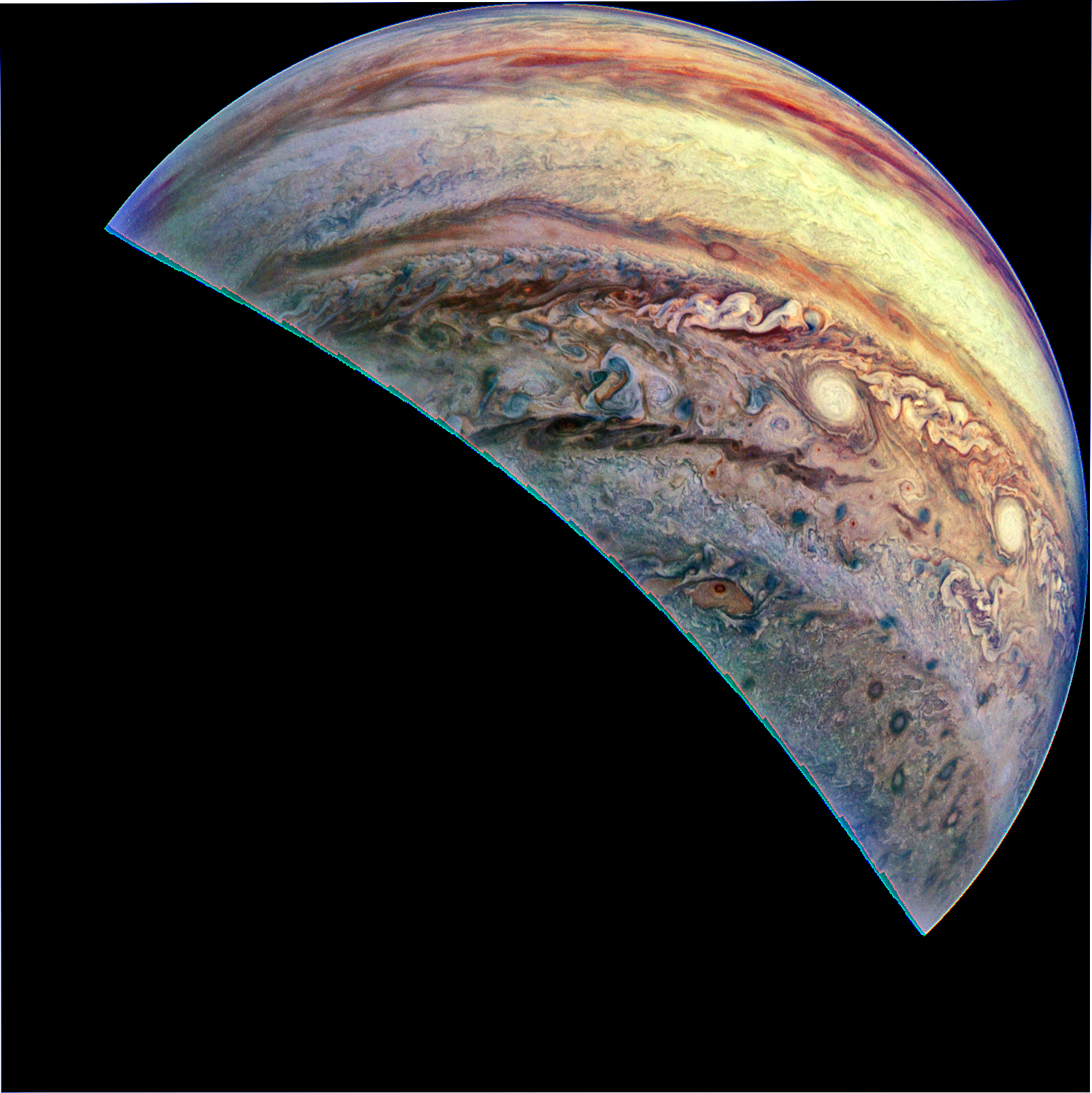 Junocam pixels are 12 bits deep from the camera but are converted to 8 bits inside the instrument using a lossless "companding" table, a process similar to gamma correction, to reduce their size. All Junocam products on the missionjuno website are in this 8-bit form as received on Earth. Scientific users interested in radiometric analysis should use the "RDR" data products archived with the Planetary Data System, which have been converted back to a linear 12-bit scale.