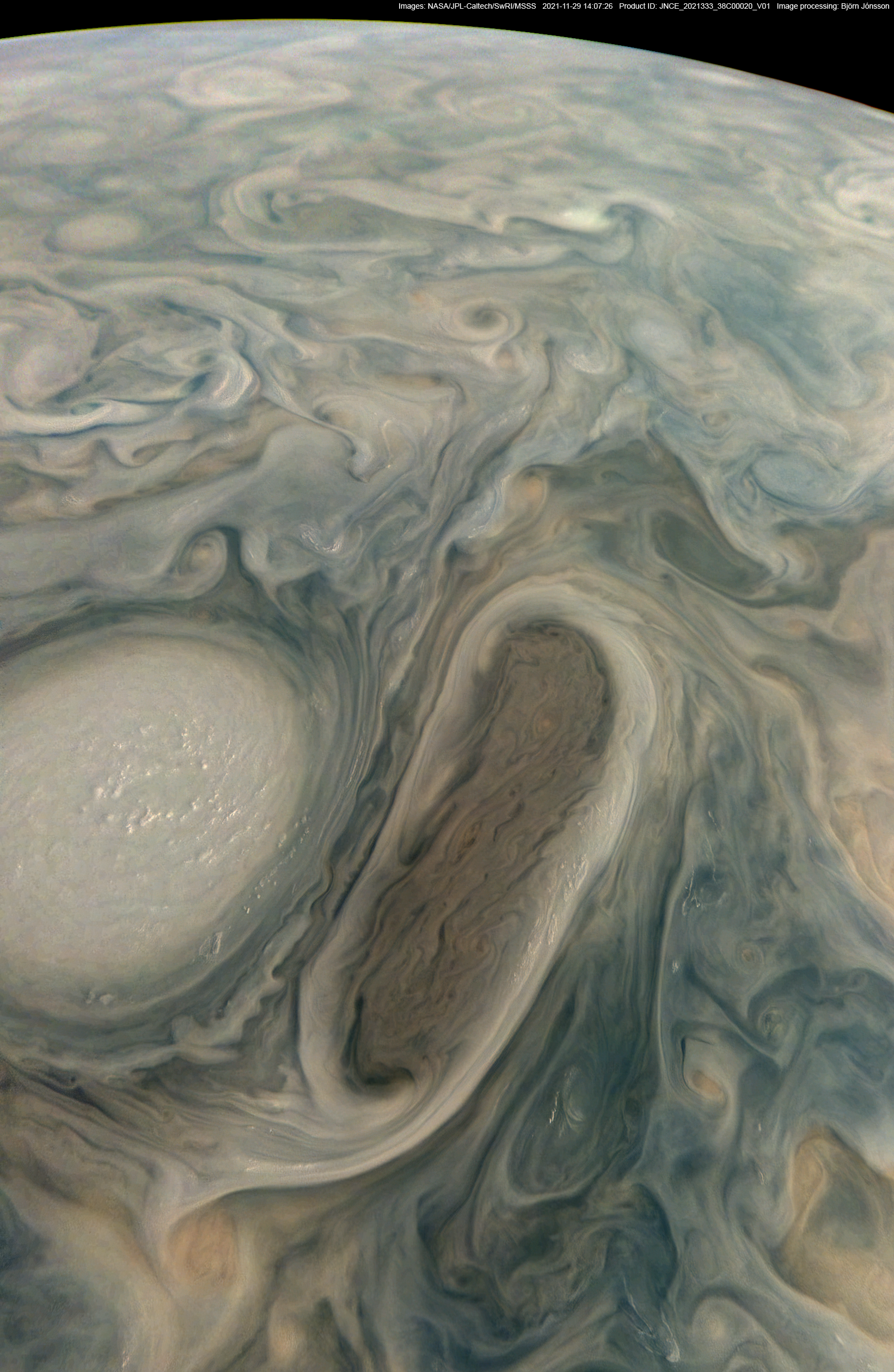 An image processed from the PJ38_20 raw image framelets. The contrast has been increased and small scale features sharpened. North is up.