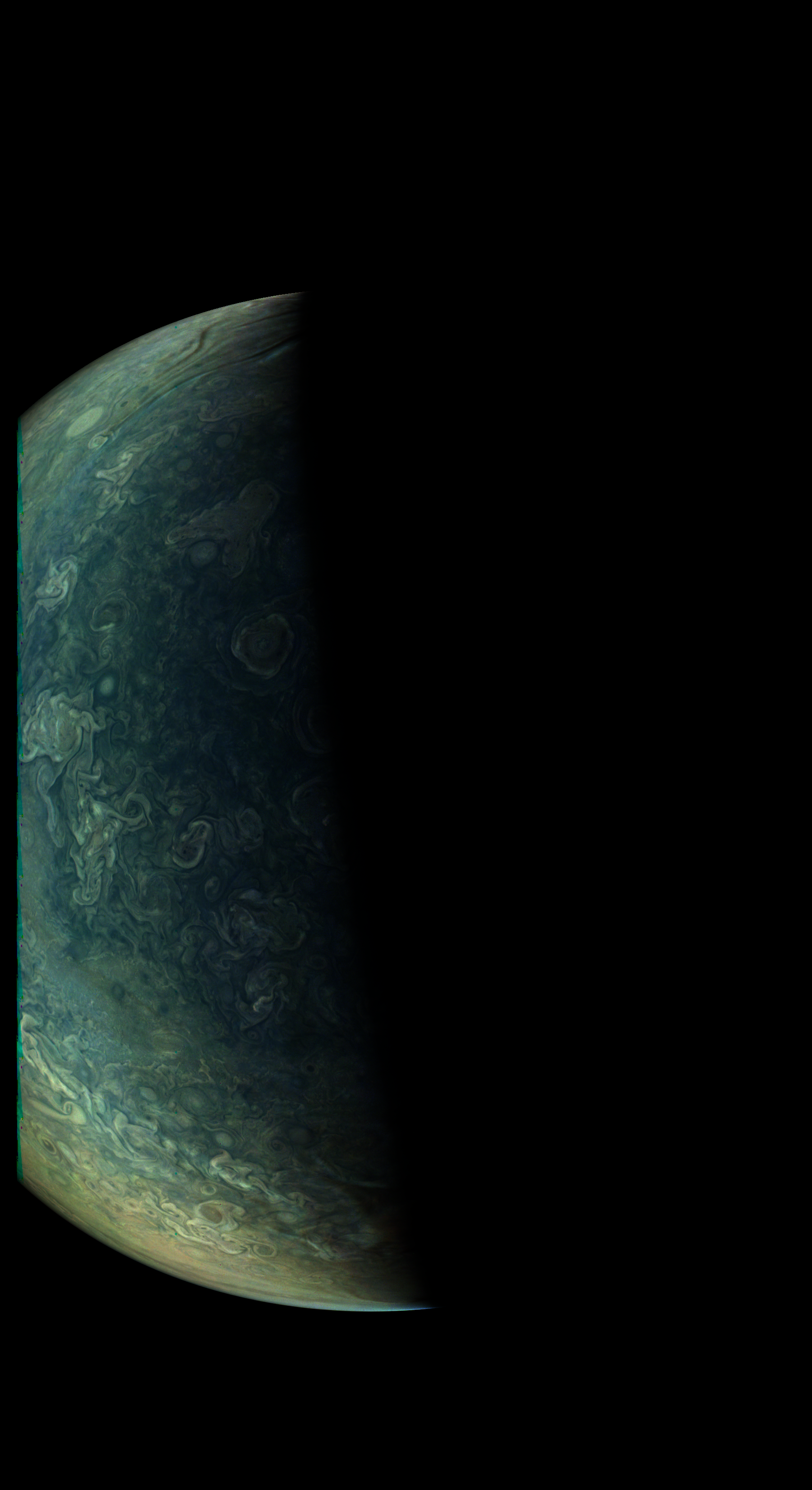 The image shows Jupiter roughly from the north. It's mostly illumination adjusted, then strongly enhanced by using the 4th power of radiometric data. Then some illumination effect is added again in order to recover the 3D appearence. The resolution of the image is similar to JunoCam's resolution.