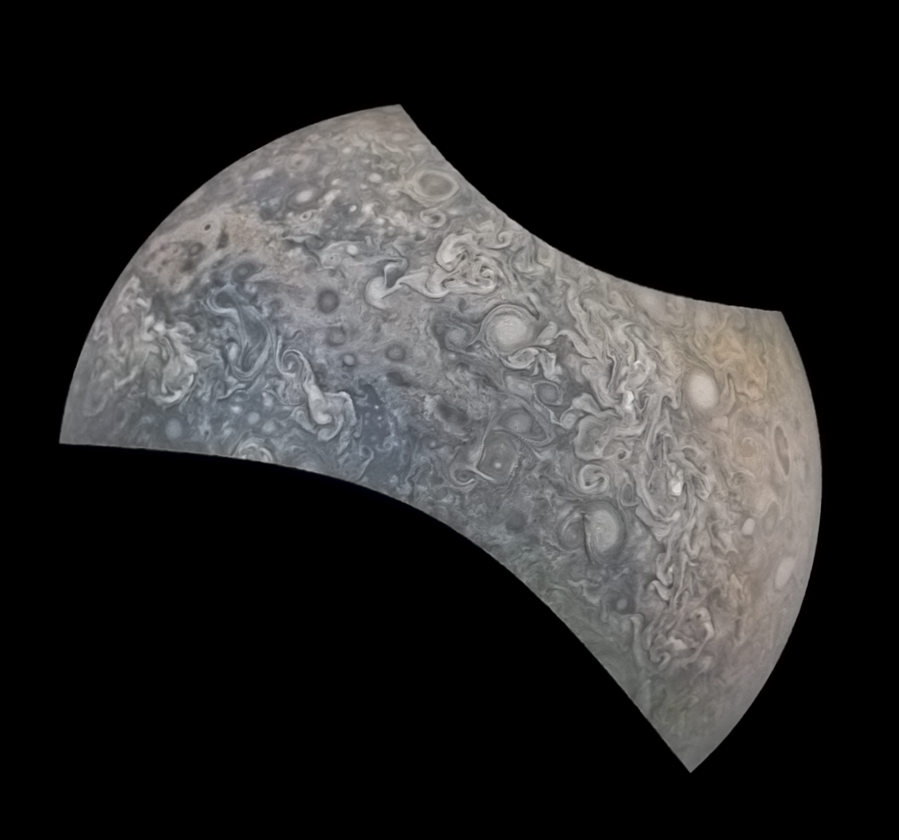 Junocam pixels are 12 bits deep from the camera but are converted to 8 bits inside the instrument using a lossless "companding" table, a process similar to gamma correction, to reduce their size. All Junocam products on the missionjuno website are in this 8-bit form as received on Earth. Scientific users interested in radiometric analysis should use the "RDR" data products archived with the Planetary Data System, which have been converted back to a linear 12-bit scale.
