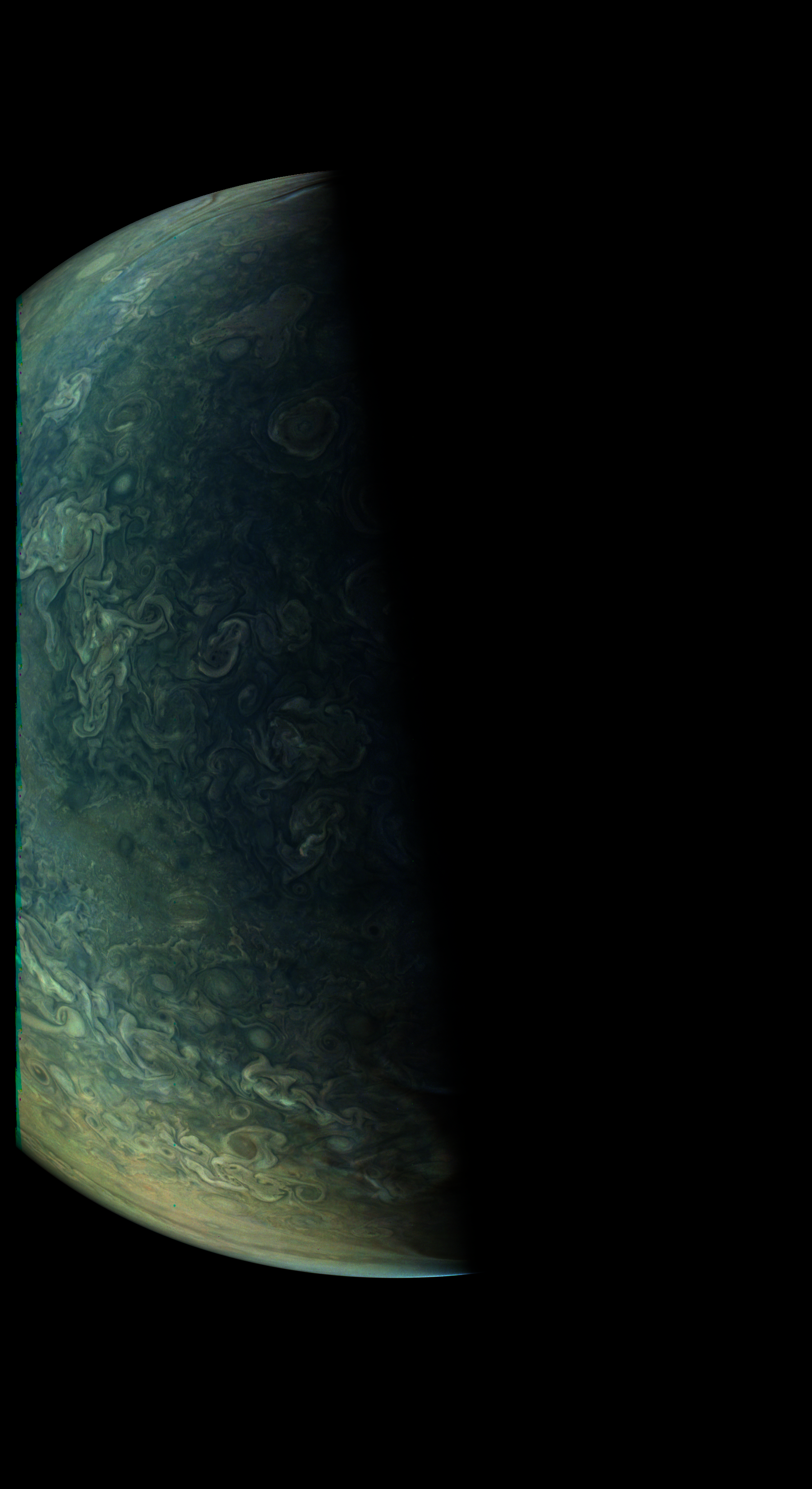 The image shows Jupiter roughly from the north. It's mostly illumination adjusted, then strongly enhanced by using the 4th power of radiometric data. Then some illumination effect is added again in order to recover the 3D appearence. The resolution of the image is similar to JunoCam's resolution.