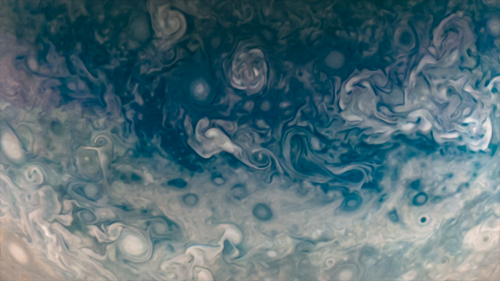 Processed using the JunoCam imager's PJ39 Northern Circumpolar Cyclones raw images and data from NASA's Juno spacecraft flyby on January 12, 2022. Enhanced to highlight features, clouds, colours, and the beauty of Jupiter. Artist's impression - not representative of true colour.