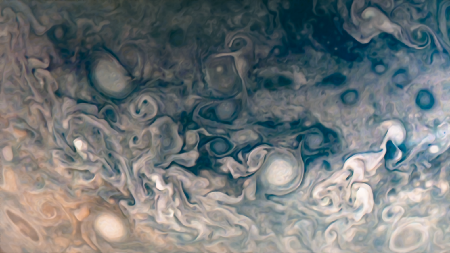Processed using the JunoCam imager's PJ39 Northern Folded Filamentary Region raw images and data from NASA's Juno spacecraft flyby on January 12, 2022. Enhanced to highlight features, clouds, colours, and the beauty of Jupiter. Artist's impression - not representative of true colour.
