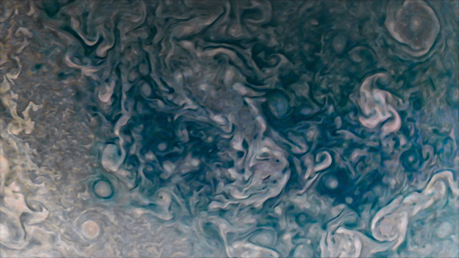 Processed using the JunoCam imager's PJ42 Northern Folded Filamentary Region raw images and data from NASA's Juno spacecraft flyby on May 23, 2022. Enhanced to highlight features, clouds, colours, and the beauty of Jupiter. Artist's impression - not representative of true colour.