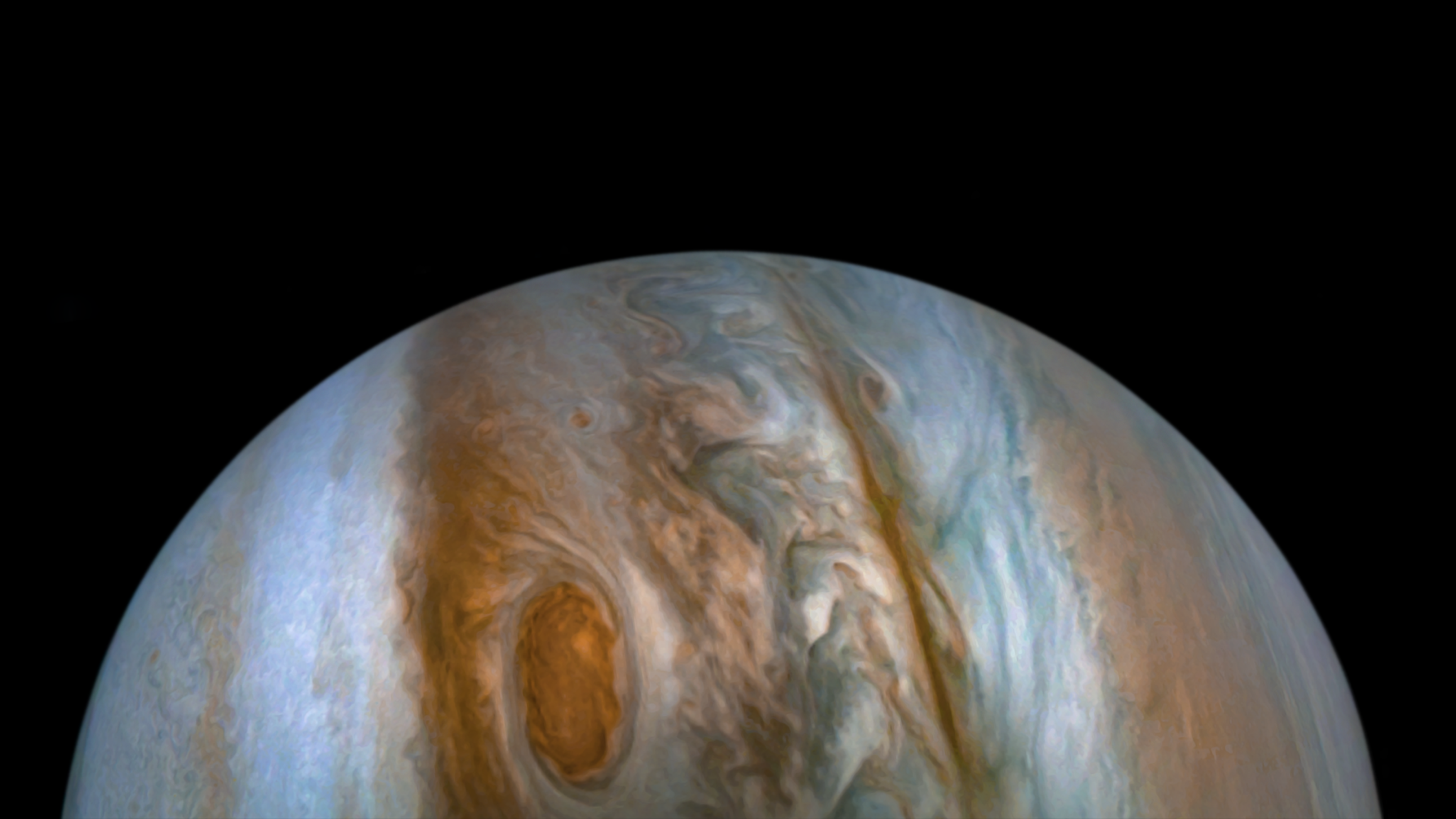 Processed using the JunoCam imager's PJ14 South Equatorial Belt North raw images and data from NASA's Juno spacecraft flyby on July 16, 2018. Enhanced to highlight features, clouds, colours, and the beauty of Jupiter. Artist's impression - not representative of true colour.