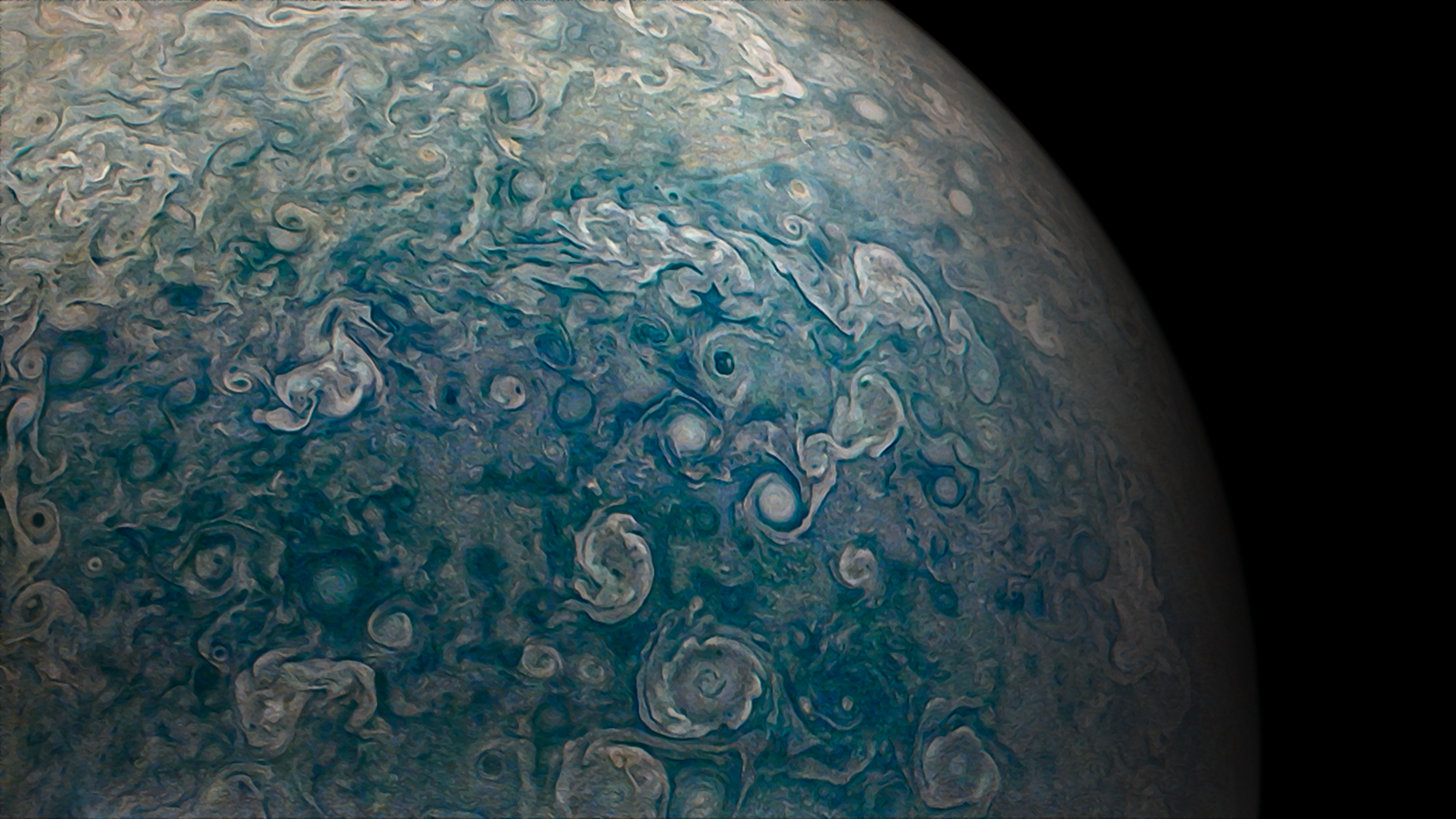 Processed using the JunoCam imager's PJ43 Northern Circumpolar Cyclones raw images and data from NASA's Juno spacecraft flyby on July 5, 2022. Enhanced to highlight features, clouds, colours, and the beauty of Jupiter. Artist's impression - not representative of true colour.