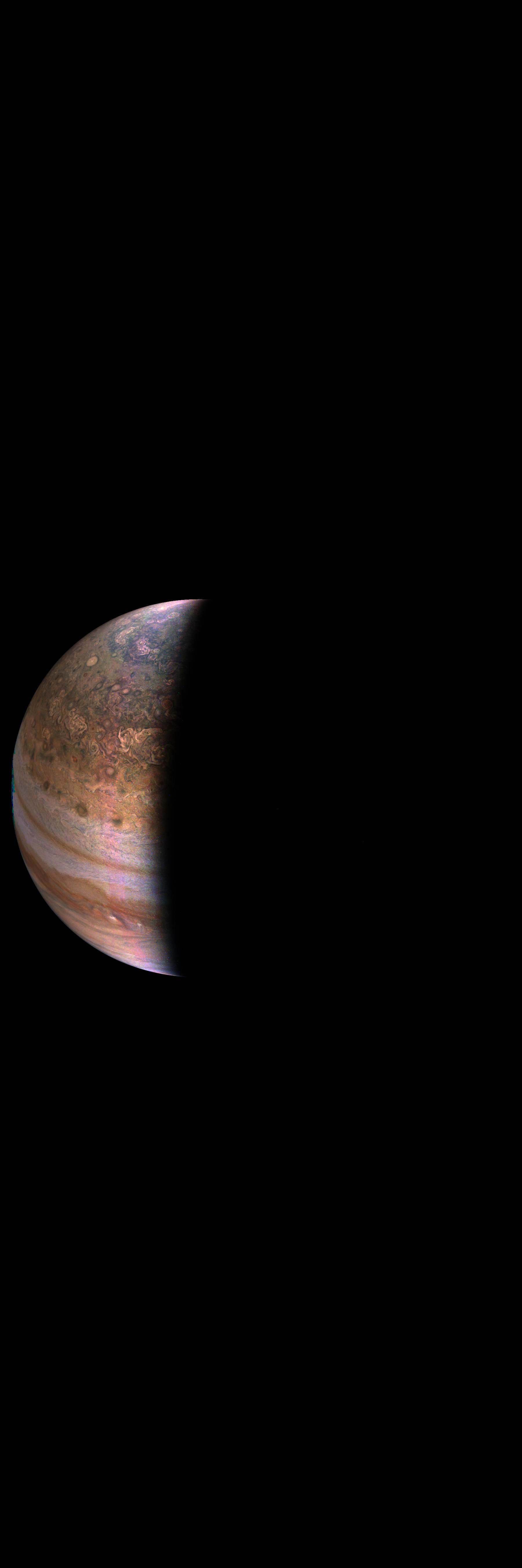 Junocam pixels are 12 bits deep from the camera but are converted to 8 bits inside the instrument using a lossless "companding" table, a process similar to gamma correction, to reduce their size. All Junocam products on the missionjuno website are in this 8-bit form as received on Earth. Scientific users interested in radiometric analysis should use the "RDR" data products archived with the Planetary Data System, which have been converted back to a linear 12-bit scale.
